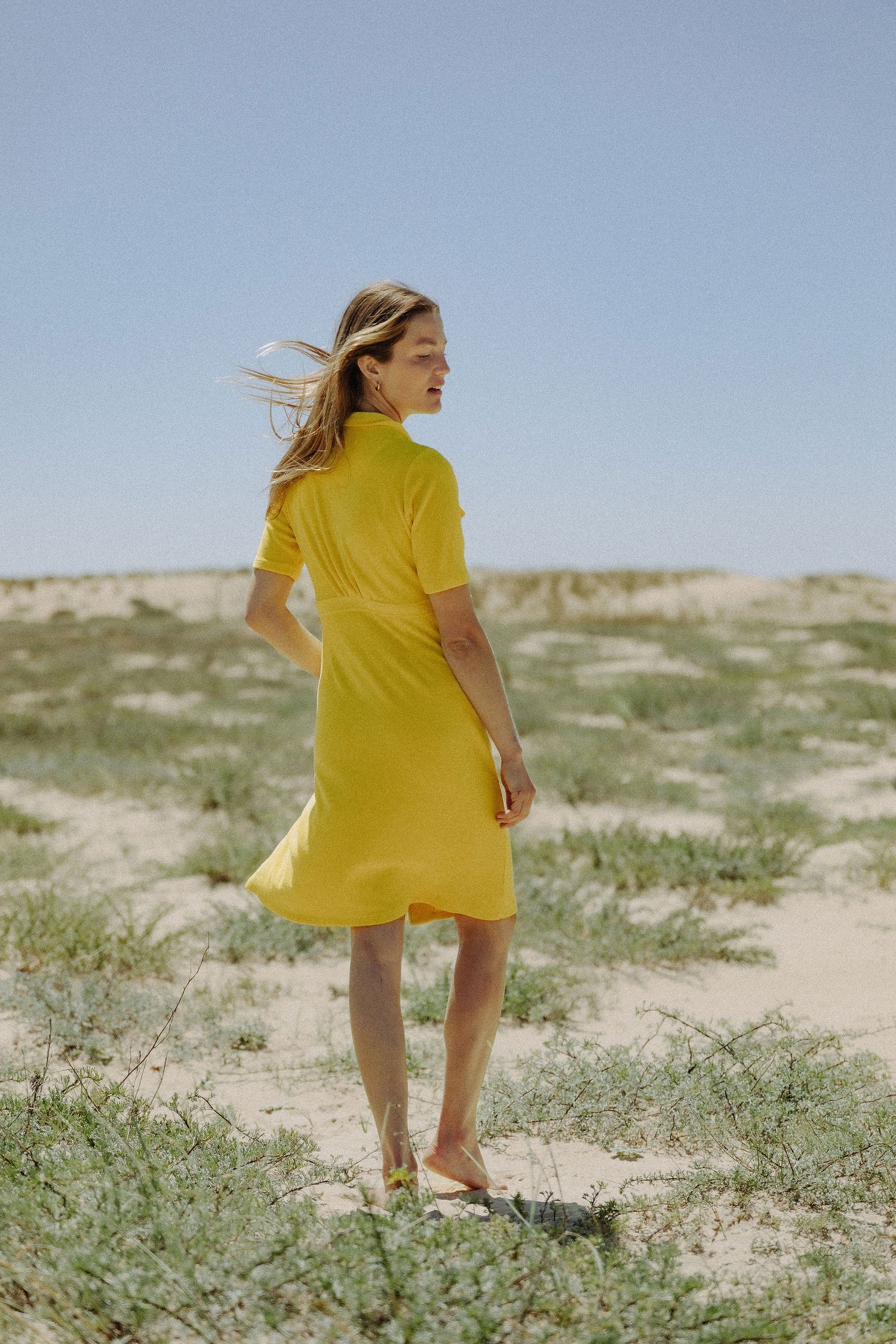 La forme de la robe saharienne est ensuite déclinée en un polo, un pantalon large, une veste et un bermuda.